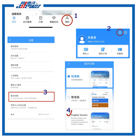 Íoslódáil an aip 12306, téigh go dtí "Mise (ag bun) → "Socruithe" → "Athraigh Leagan" → roghnaigh Béarla chun aistriú go dtí an leagan Béarla.