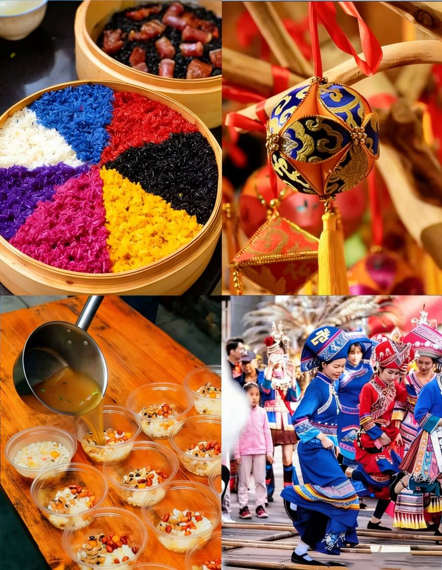 Chomh maith leis an amhránaíocht, ceiliúrann daoine trí Rís Glutinous Five-Dath a ullmhú daite le súnna plandaí, ag caitheamh liathróidí bróidnithe, ag damhsa damhsaí cuaille bambú, agus ag imirt drumaí cré-umha.
